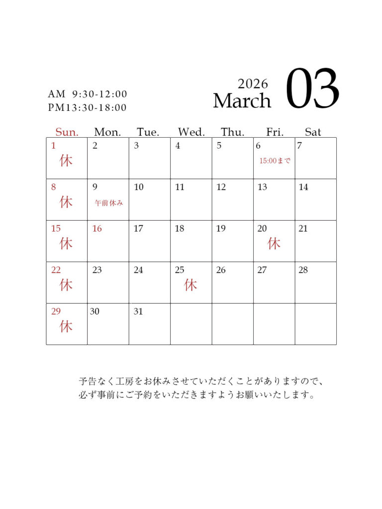 予告なく工房をお休みさせていただくことがありますので、必ず事前にお時間のご予約をいただきますようお願いいたします。
